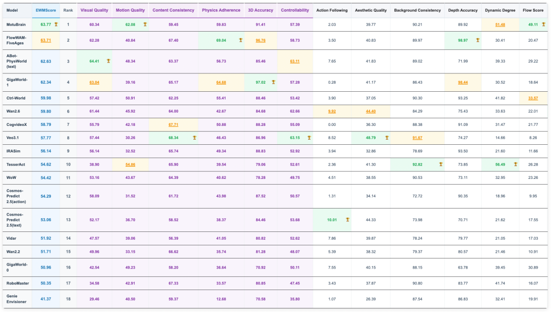 在 WorldArena 上,MotuBrain 以 63.77 的总体 EWM Score 位居第一,从结果来看,其表现超越了高德的ABot、极佳GigaWorld-1等模型,并在 Motion Quality、Flow Score、Motion Smoothness 等多个关键运动维度上全面领跑。
