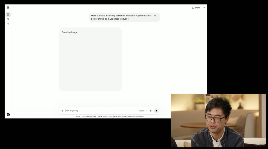 在直播中,OpenAI 图像研究团队的成员陈博远展示了一个案例,他给出提示词:「Make a artisitic marketing poster for a fictional OpenAI bakery.The poster should be inJapanese language.」
