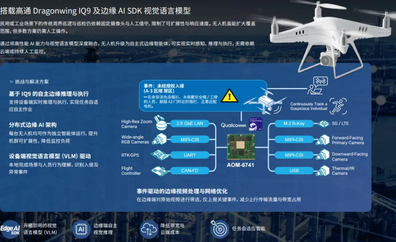 AI 就绪、生态标准化为核心的无人机开发底座,集成 SLAM、激光雷达、IMU 等技术,适配无 GNSS 信号的室内外全场景定位;支持 5G/Wi-Fi/LoRa 多协议通信栈与自适应故障切换,保障超视距作业的稳定连接。推出超视距自主管道巡检、视觉推理自主巡逻无人机解决方案,依托边缘 AI 算力实现缺陷实时识别、异常行为自主判断,广泛应用于基础设施巡检、公共安全巡逻、农业巡检等场景,实现无人机从 “人工操作” 到 “自主智能” 的跨越。