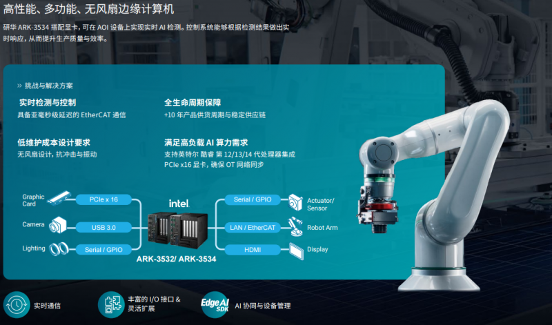 AI 模块集成等技术难点,打造端到端边缘 AI 智能自动化解决方案。方案搭载英特尔酷睿系列处理器,支持 CPU/NPU/GPU 灵活扩展,搭配 EtherCAT/TSN 低延迟实时通信、Preempt RT 实时 Linux 系统,实现多轴机械臂毫秒级同步控制;集成 AI 视觉检测、视觉引导分拣等功能,成功落地焊接自动化、AOI 检测、仓储分拣等场景,让机械臂从 “重复操作” 升级为 “智能决策”,大幅提升工业生产的柔性化与自动化水平。
