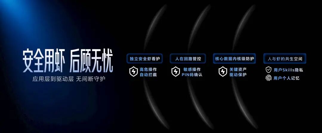 独立安全虾全程监控:自动拦截格式化硬盘、重装系统等高危操作;涉及支付登录、摄像头调用、对外发送文件等敏感行为强制二次确认;