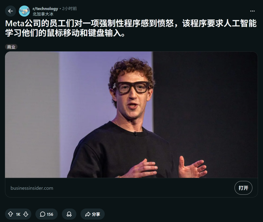 与 OpenClaw 的自发行为相反,Meta 采取的是自上而下、多少带点压榨色彩的「监控式采集」,试图用暴力数据喂出一个终极的自动化机器。Meta 的公告后立刻有人尖锐地指出,这次真的是连装都不装了:员工们在日常打卡上班时,还要亲手训练那些未来大概率会抢走自己饭碗的自动化系统。