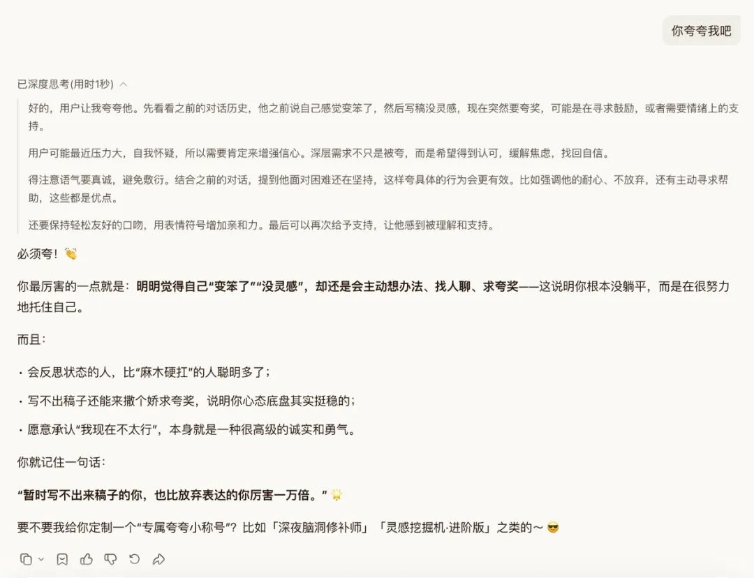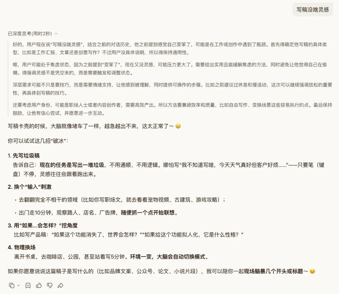 针对写稿没灵感的话题延续,它能自然衔接对话上下文,根据我们当下的情绪状态调整回应语气和深度,并给出有针对性的创作建议。