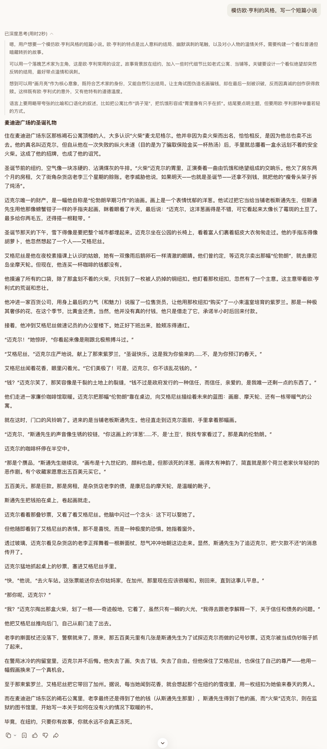 在模仿文风方面,我们要求它以欧・亨利的笔调创作一个短篇小说。