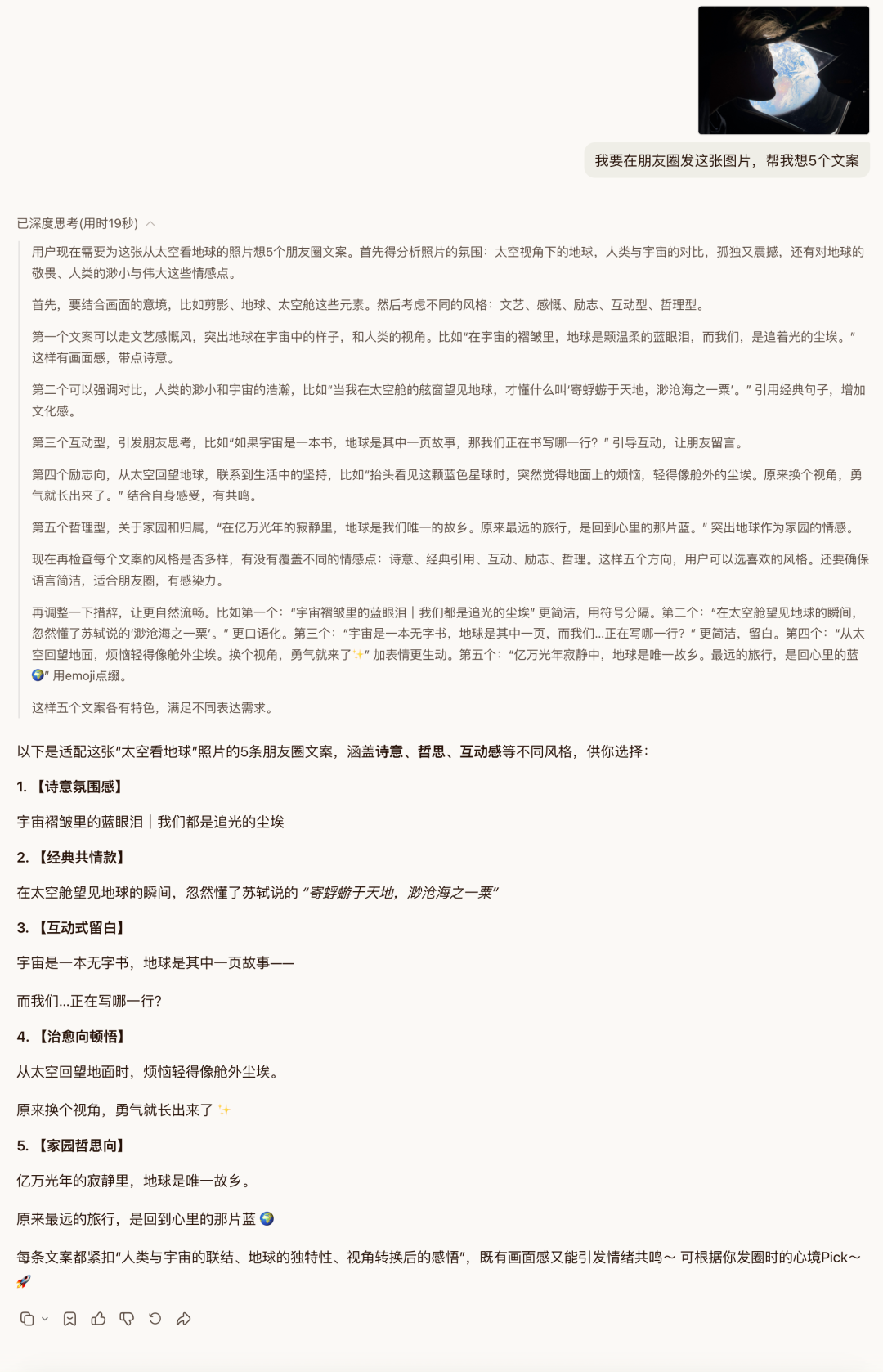 我们让 Hy3 preview 为这张图片生成 5 条朋友圈文案。它先分析了图片氛围,选择了孤独震撼、对地球的敬畏、人类渺小与伟大等几个情感点,生成了不同风格的文案,有文艺挂的、有哲学性的,随便拿出来一条就能发朋友圈。