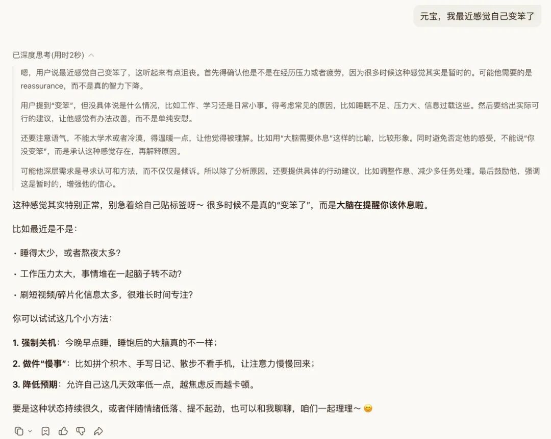 和 Hy3 preview 吐槽自己最近变笨了,它耐心开解可能是最近睡得太少、工作压力大或者刷短视频太多,并给出了 3 个小 tips。