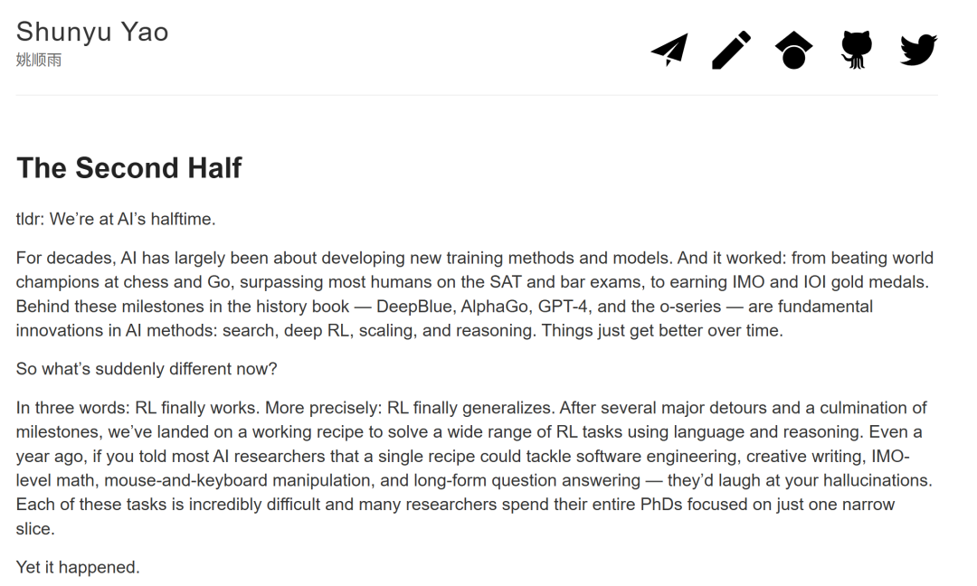 在《大模型的下半场》中姚顺雨曾指出,现有的大模型「配方」(预训练 + 强化学习 + 算力扩展)已经高度成熟,具备了泛化和解决难题的能力,下半场的逻辑在于提出问题:「我们应该训练人工智能做什么?」