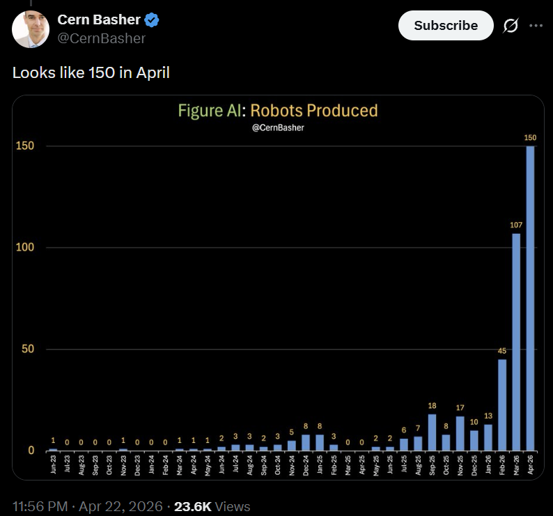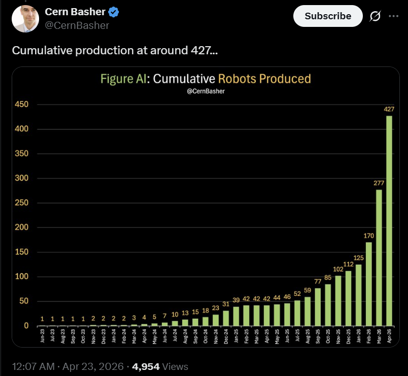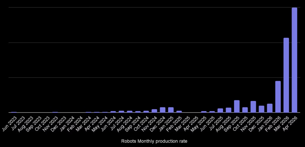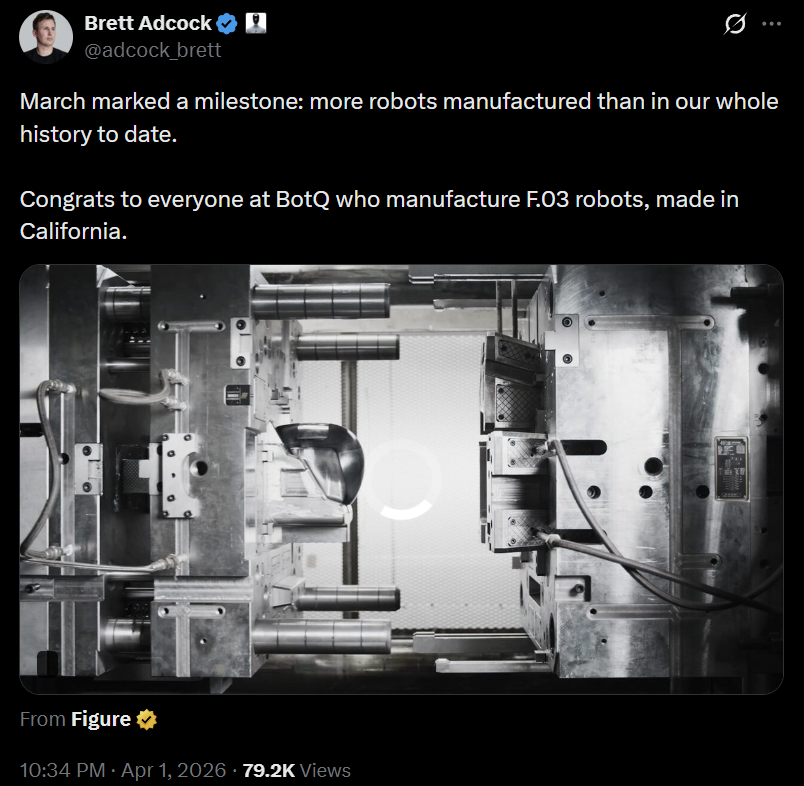 温馨提示:扫描文末二维码,加入知识星球,免费下载2700+行业报告(包含海外投行报告);商务和研究咨询合作请联系16620948826(同微信)Figure 首席执行官 Brett Adcock 分享了一张生产图表,显示BotQ 工厂将于 2026 年 2 月开始大规模加速生产。虽然Y轴没有明确的标签,但分析师估计2026年4月的产量将达到约150 辆,与2025年个位数的月产量相比,这是一个巨大的增长。成立至今累计产量457台。此次产能提升支持Figure实现其目标,即到2026年夏季实现24/7全天候自主运营和供应链完全解耦。这一激增恰逢向Figure 03过渡,该过渡利用压铸等大批量模具将成本降低 90%。Figure公司首席执行官Brett Adcock发布了一张新的图表,展示了这家总部位于加州的机器人公司近期的发展势头,图表中呈现了一条“曲棍球棒”式的增长曲线。这张题为“Figure公司每月生产的人形机器人数量”的图表追踪了该公司从2023年6月到2026年4月的产量,揭示了其从研发原型制作向工业规模生产的重大转型。首席执行官布雷特·阿德科克分享的一张生产图表显示,博茨瓦纳工厂的生产量呈现显著的“曲棍球棒”曲线。2026年初的急剧增长与公司向Figure 03型生产线的转型相吻合,该生产线从一开始就旨在实现大规模生产虽然图表清晰地展示了Figure的生产轨迹,但值得注意的是,它缺少标注Y轴的标签,导致其确切的产量无法得知。这一疏漏在机器人领域引发了一波数字取证热潮,观察人士试图量化Figure当前的“运行速度”。尽管缺少图例,但X平台迅速对数据进行了相对缩放。知名人士@CernBasher发布了图表的详细分析,指出Figure仅在2026年4月就生产了约150台。这一估算基于柱状图的相对高度。如果2024年末出现的个位数产量代表的是Figure 02早期原型,那么2026年2月和3月的垂直激增则表明生产线已过渡到Figure 03。虽然Adcock尚未核实这些具体数字,但柱状图的规模表明,Figure在过去60天内生产的机器人数量超过了其三年历史的总和。Figure AI成立于2022年5月,总部位于美国加利福尼亚州桑尼维尔,主要从事研发和生产AI人形机器人,致力于解决人形机器人的具身智能问题,推动人形机器人在家庭和商业场景的规模化部署。2023年5月完成7000万美元的A轮融资,2024年2月获得约6.75亿美元的B轮融资。2025年9月16日,Figure AI宣布完成C轮融资,筹集超10亿美元,投后估值达390亿美元,创下行业新高。本轮融资由Parkway Venture Capital领投,Brookfield Asset Management、英伟达、Macquarie Capital、英特尔资本、Align Ventures、Tamarack Global、LG Technology Ventures、Salesforce、T-Mobile Ventures、高通创投等多家行业巨头参投。Figure AI成立仅4年,累计融资近20亿美元,估值两年内增长近100倍,2025年9月投后估值达390亿美元。Figure AI在2023 年推出其首款人形机器人Figure01;2024 年推出 Figure02,去年 11 月,Figure宣称在宝马汽车工厂工作的 Figure 02 机器人每天已经能够完全自主地完成 1000 个安插汽车金属件的任务;2025年年3月,Figure推出全新设计的 Figure 03,几乎从零重新设计,包括定制执行器、电机和2.3kWh容量电池组,单次充电可持续工作5小时。2023 年 12 月向首位客户交付 Figure02 用于仓储与制造场景作业;2024年2月,Figure又向第二位商业客户交付了Figure 02,并宣称在30天内实现了单一神经网络控制下的端到端作业。2025年3月,Figure 宣布打造了新型人形机器人大规模生产基地BotQ,第一代生产线每年可制造多达 1.2 万台人形机器人。为实现规模化生产,BotQ 采用垂直整合制造模式以控制生产流程、保障产品质量,搭建了包含自研核心制造执行系统(MES)及产品生命周期管理(PLM)、企业资源计划(ERP)、仓库管理系统(WMS)的软件基础设施,还依托内部 AI 系统 Helix 落地 “机器人造机器人” 模式(用于组装关键部件与工位间物料搬运,无需传送带)。此次加速推进的时机与Figure公司位于BotQ工厂近期取得的里程碑式成就完美契合。2026年4月,Adcock声称该工厂已能实现每90分钟生产一台机器人。与之前的版本不同,Figure 03专为大规模生产而设计,用压铸件和注塑成型工艺取代了昂贵的数控加工零件。Figure公司首席执行官Brett Adcock此前亦透露了2026年的生产路线图。初始产能:生产线设计初始年产量为 12,000 台。