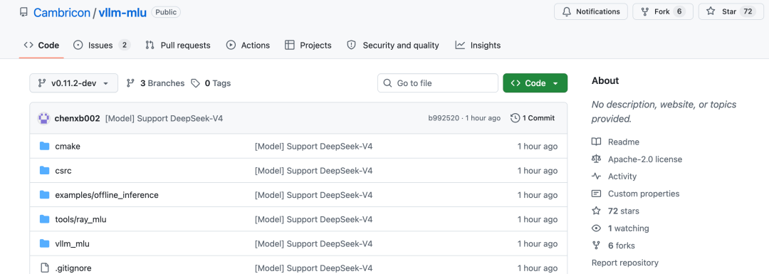 第一时间,寒武纪基于 vLLM 推理框架完成了对此次 285B DeepSeek-V4-flash 和 1.6T DeepSeek-V4-pro 两个版本的 Day 0 适配,适配代码已开源到 GitHub 社区。