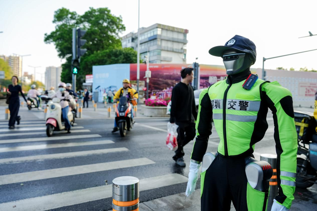 深圳某路口,一台穿着交警制服的机器人正在执勤。它能联动信号灯指挥交通,能识别非机动车闯红灯,能用标准普通话劝导行人。路过的行人有人驻足拍照,也有人绕道而行。