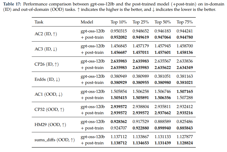 基础模型与后训练模型在多维度科学任务下的表现对比。 重点展示了模型在域内(ID)与域外(OOD)环境下的适应性差异,加粗项反映了后训练技术对模型逻辑推理和泛化能力的提升。