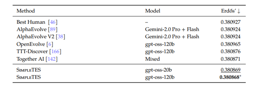 结果也很有意思——人类和现有 AI 基本都卡在 0.38087 附近,已经接近公认极限。但 SimpleTES 还是硬生生往下抠了一点:做到 0.380868,甚至在额外搜索中达到 0.380856。表面看只是小数点后几位,在这种问题里却是实打实的「极限推进」。