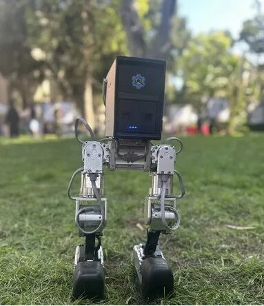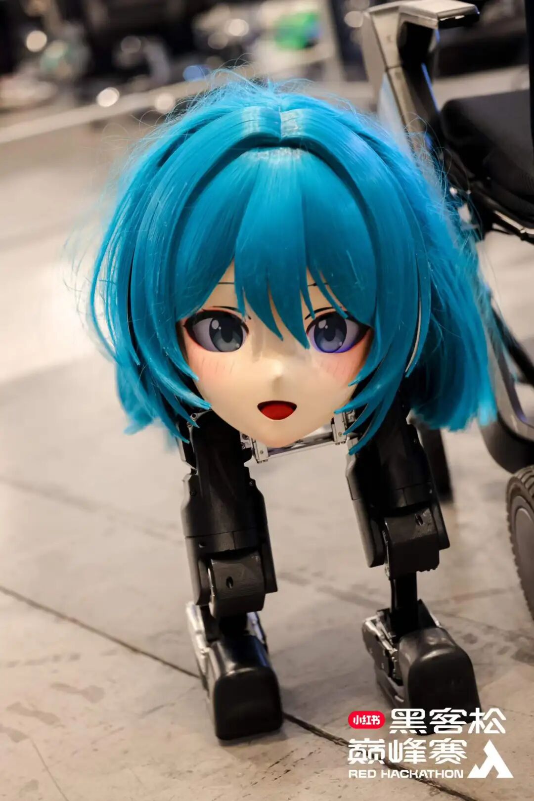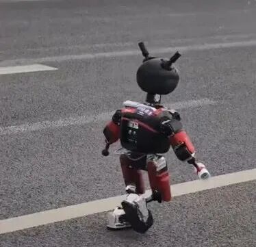 一台脑袋直接长在腿上的机器人晃晃悠悠地走了出来,没有躯干,没有手臂,脑袋上顶着一个憨态可掬的二次元表情包。