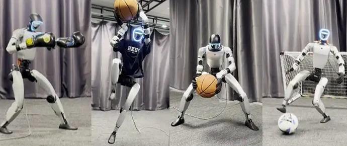 还有例如香港科技大学和上海人工智能实验室开源的Human X,只需要一段人类视频,就能训练出对应的物体交互技能。当人类挥舞拳击手套或者假装要投篮,机器人会出现本能直觉一样的应激反射,主动和人类博弈。