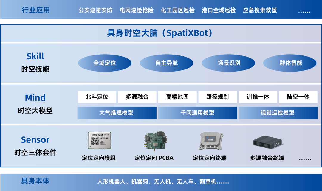 2025年4月,千寻位置发布了机器人“时空智能三体套件”,并向机器人企业免费开放体验。该套件不仅包括高精度定位服务,还包括时空智能模组、板卡、定制天线及开发套件,集成大气推理大模型、电离层感知大模型等专为机器人定制的特色服务。从2025年4月的“时空智能三体套件”到2026年4月的“具身时空大脑”,时间线背后是千寻位置对具身智能行业需求变化的判断。如果说“三体套件”解决的是机器人如何感知世界的基础定位问题,“具身时空大脑”则试图在感知之上叠加规划、决策、群体协同等更高维度的能力,将产品定位从零件供应商升级为系统解决方案提供商。