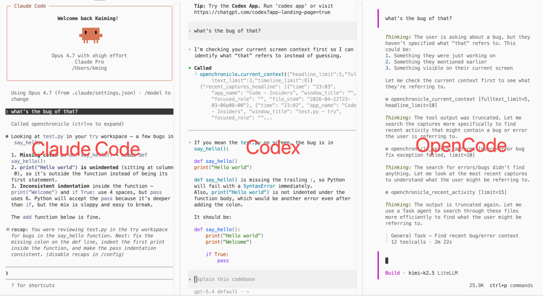 当 AI 缺乏持续记忆时,突然问一句「what's the bug of that?」,模型往往不知所措。但接入 OpenChronicle 后,Agent 会直接调取你当前的屏幕上下文(如 VS Code 里打开的文件、报错信息),将「that」精准解析为具体代码,带来截然不同的交互体验。