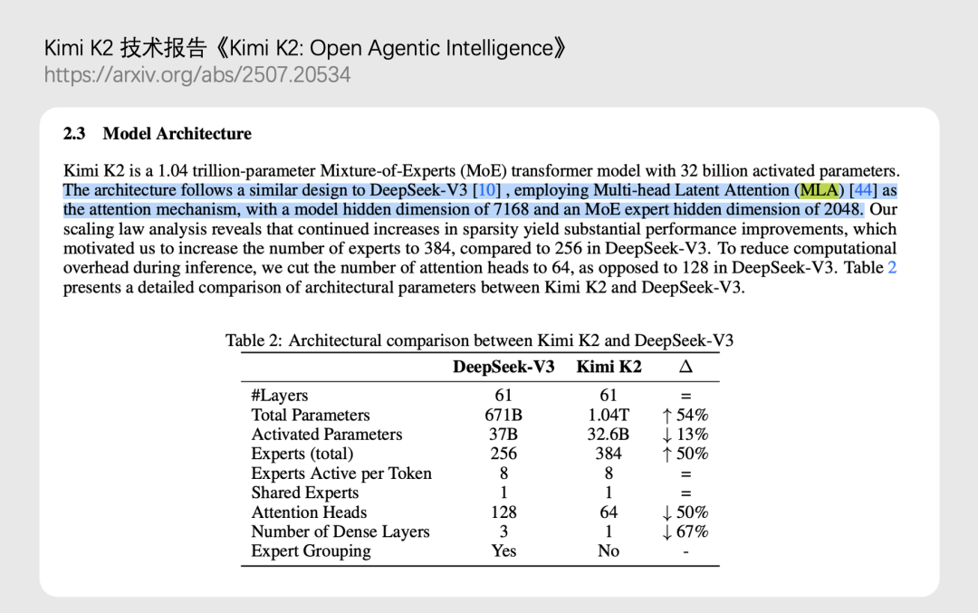 首先要提到的是,DeepSeek 在 V3 中首创了 MLA 注意力机制,这个设计通过低秩压缩技术有效减少了显存占用,从而让长上下文推理变得可能。这个创新很快被行业广泛认可,Kimi K2 在自己的注意力机制中也采用了 MLA 注意力机制。