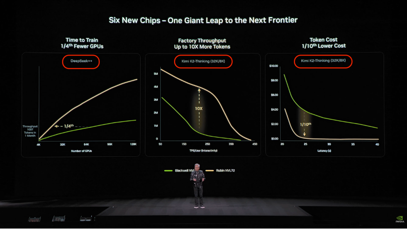 而在黄仁勋的CES主题演讲上,黄仁勋更是将 DeepSeek 和 Kimi K2-Thinking 模型赫然放上大屏幕,作为展示其下一代 Blackwell 与 Rubin 芯片强大性能的 Benchmark 标杆: