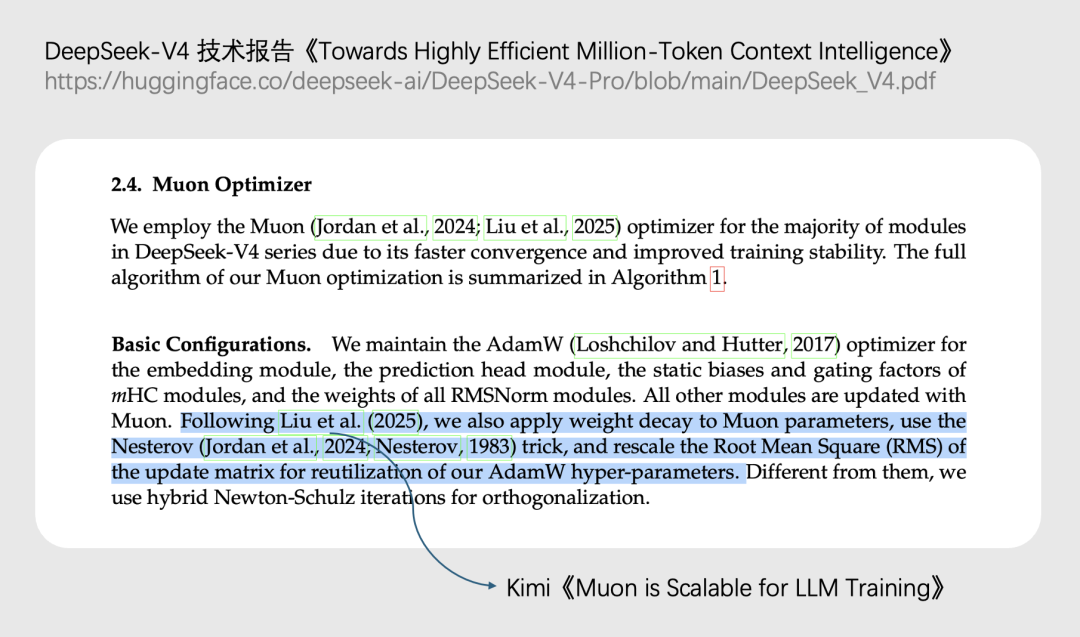 如今,DeepSeek V4 也跟进用 Muon 优化器技术,实现训练效率的稳定性。两家公司将底层的优化技术相互吸纳,打破了技术壁垒,展现出前所未有的深度合作。