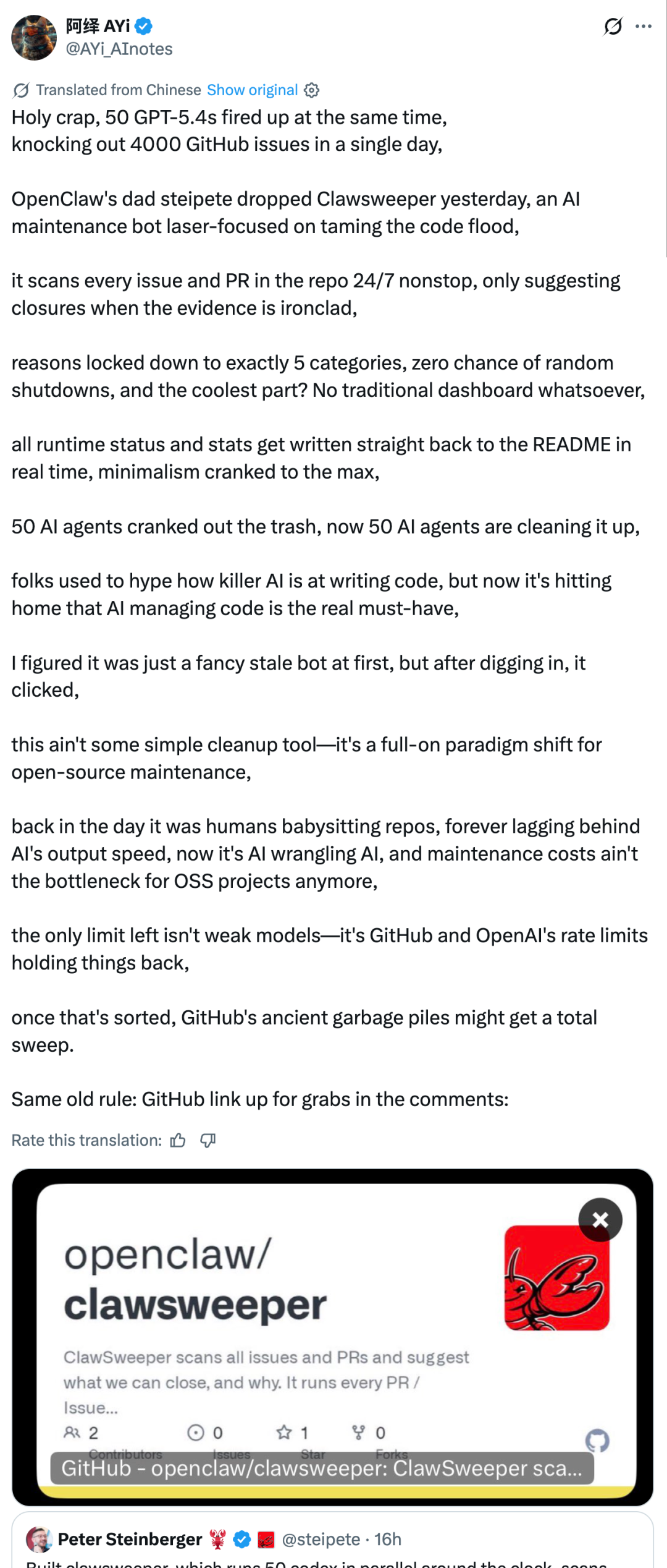 昨天晚上,OpenClaw 之父 Peter Steinberger 发布的最新项目「Clawsweeper」实现了这一切。