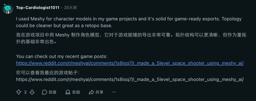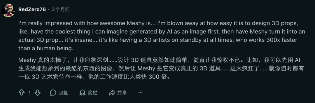 来自 Reddit 等社交平台的反馈则更直观地印证了这一点:当 Meshy 把 3D 建模的门槛彻底拉低,那些从未碰过专业工具的普通人,第一次尝到了「我也能做到」的惊喜。有人甚至玩到停不下来。