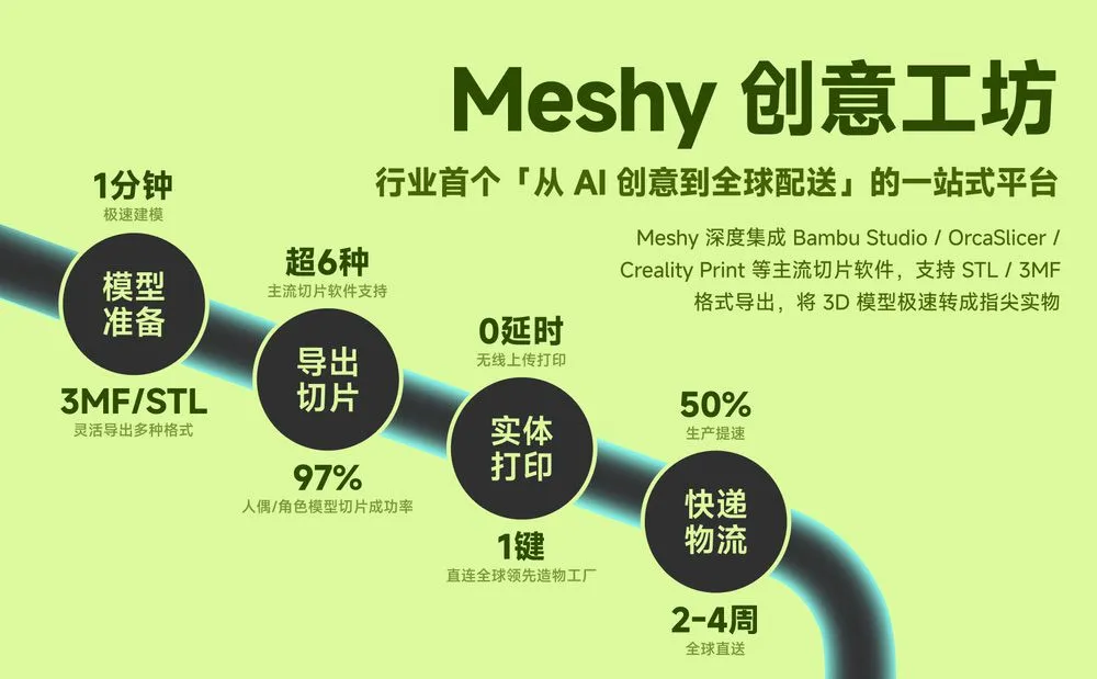 其次,在产品形态上,他们也展开了更多样化的探索。之前 Meshy 更多是个 SaaS 工具,靠订阅赚钱,但现在他们明显在往平台化的方向转。最近推出的「Meshy 创意工坊」就是个信号 —— 你在 Meshy 上建好模,如果不想自己打印,可以直接一键下单,后台的工业级打印工厂把模型修复、生产、全球发货全包了。说白了,这就是在搭一个「AI 建模 + 工业制造 + 全球交付」的闭环。配合最近和一堆 3D 打印厂商的批量签约,他们跟产业链绑得越来越紧。这种模式下,收入结构也会跟着变,从纯工具订阅慢慢转向平台抽成,盈利空间自然就不一样了。