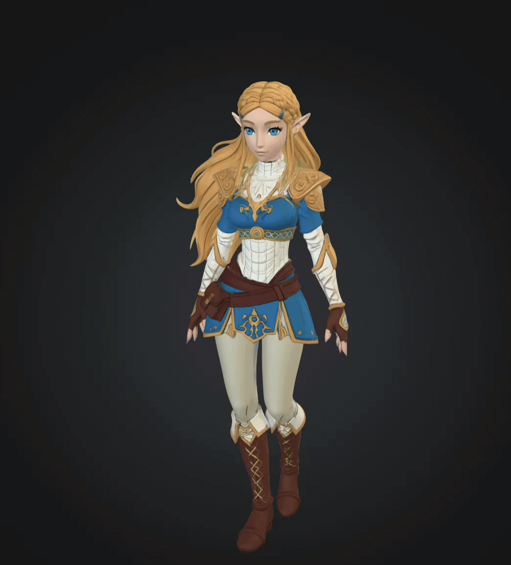 首先来看这个「塞尔达公主」。在仅有一张参考图的情况下,Meshy 6 要自己去「猜」缺失的背部画面、深度等信息。但它生成的结果身体线条非常平滑自然,肢体比例和肌肉起伏也很符合解剖学。尤其是她的手臂、腿部,曲线过渡得很流畅,几乎没有需要手动修复的生硬棱角,省了很多后期调整的时间。而且她的衣物褶皱和配饰的结构也很清晰,能看出模型的结构一致性做得很好。