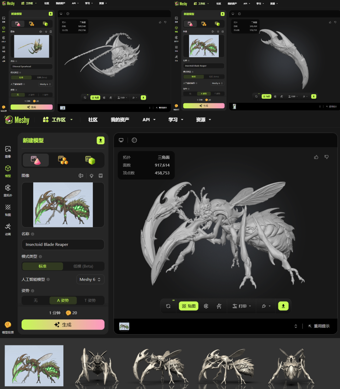 但以前他们的 3D 建模高度依赖手工高模雕刻。一个复杂的角色,光是打底就得磨好几天,完了还得在建模、雕刻、贴图多款软件之间来回倒腾,又慢又累,人力成本居高不下。直到他们把 Meshy 嵌进了自己的管线里,情况就变了。