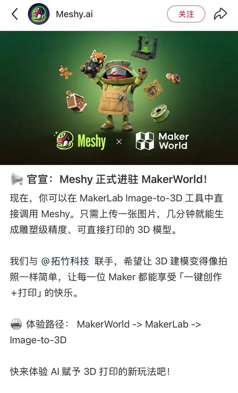 而我们之所以注意到这种玩法,是因为最近一则醒目的消息:3D 打印界扛把子拓竹的模型平台 MakerWorld 迎来了一位新盟友 —— 胡渊鸣创立的 Meshy AI。