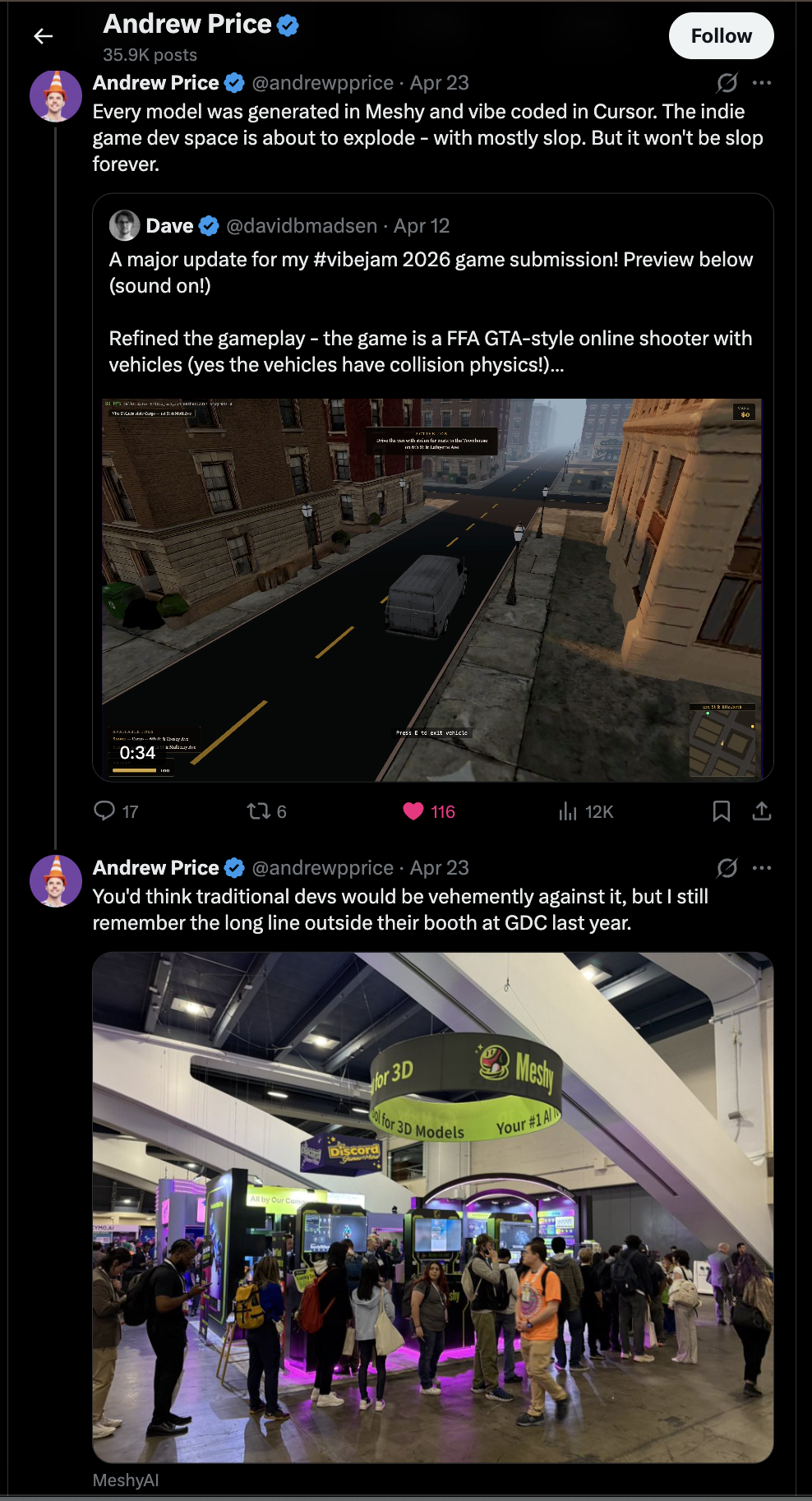 三七互娱之外,我们发现在社交平台上,其他游戏制作者也记录了相似的使用体验。有的说 Meshy 贴图能力扎实,色彩干净无异常瑕疵;有的说它可以完成整个资源管线,「低多边形」功能非常实用。开发 blender 甜甜圈教程的祖师爷 Andrew Price 在用过 Meshy 之后更是直接感叹说,「没有 AI 辅助,3D 艺术家无法实现如此高效的速度」。