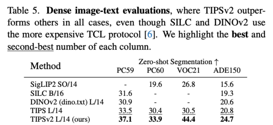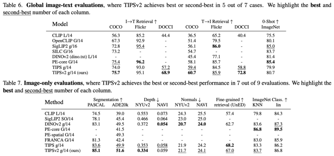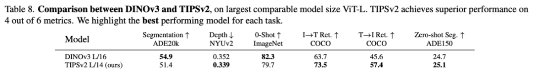 最终战绩:在 6 项高度重合的共享评估任务中,TIPSv2 赢下了其中的 4 项(包括极具挑战性的零样本分割核心任务),证明了图文双模态联合约束优于单一纯视觉预训练。