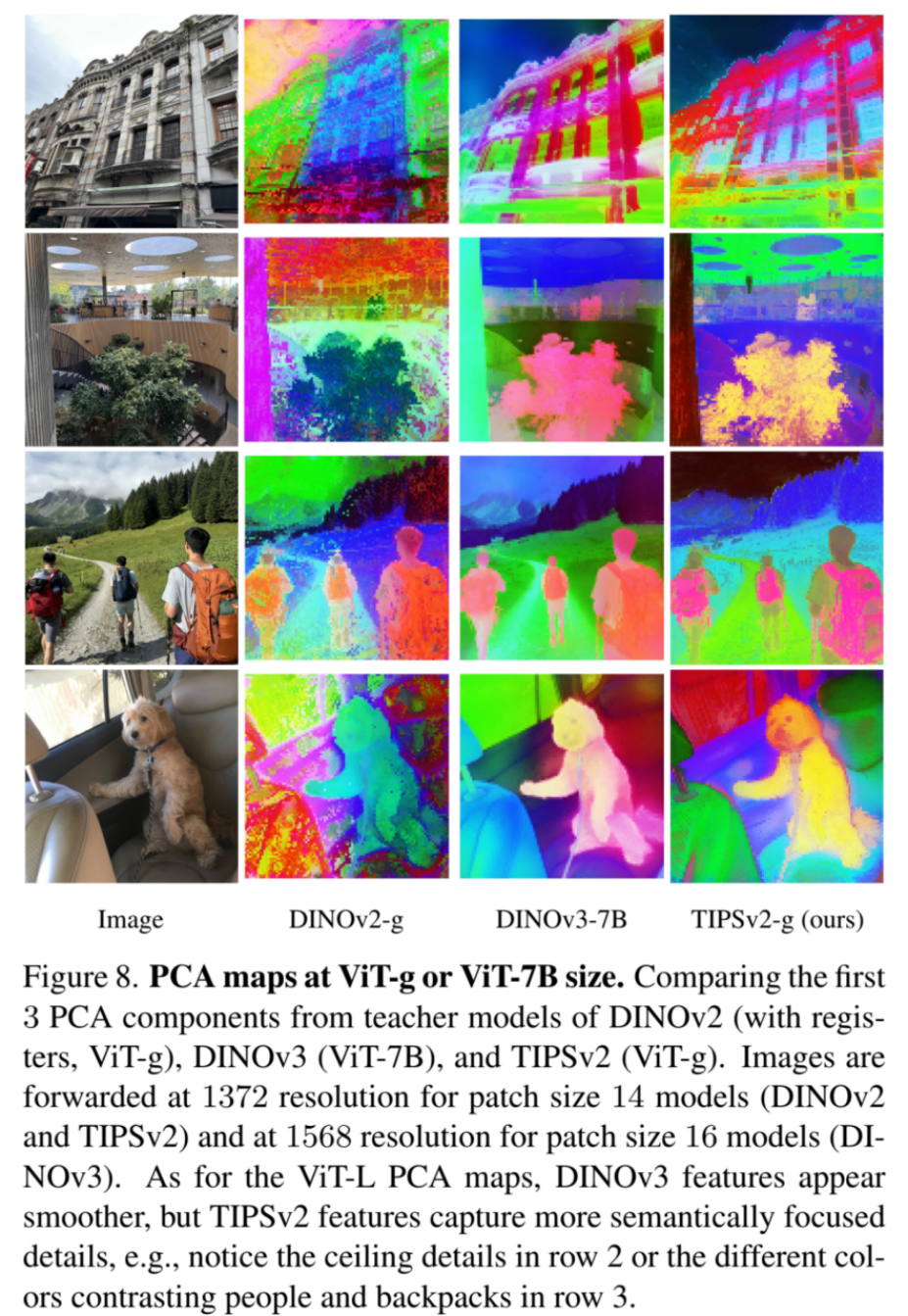 2) 极强的语义聚焦能力:即便与同样以特征平滑著称的 DINOv3 相比,TIPSv2 对物体边界轮廓的勾勒也要更加精准和锐利;并且在区域内部,TIPSv2 展现出了更丰富的 “颗粒度语义细节(Granular semantic details)”。这意味着 TIPSv2 不仅仅是 “看清” 了物体的轮廓边缘,它已经能够在没有人工标注的情况下,深度 “理解” 物体的空间语义构成。