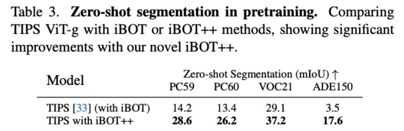 惊人效果:在不增加任何额外网络参数的条件下,iBOT++ 强制模型在所有局部区域保持细粒度的表征一致性。仅凭这一项底层逻辑的改动,就让模型在 ADE150 数据集上的零样本分割 mIoU 指标实现了 +14.1 的巨大飞跃(从 3.5 直接飙升至 17.6),一举成为了驱动密集图文对齐的最强引擎。