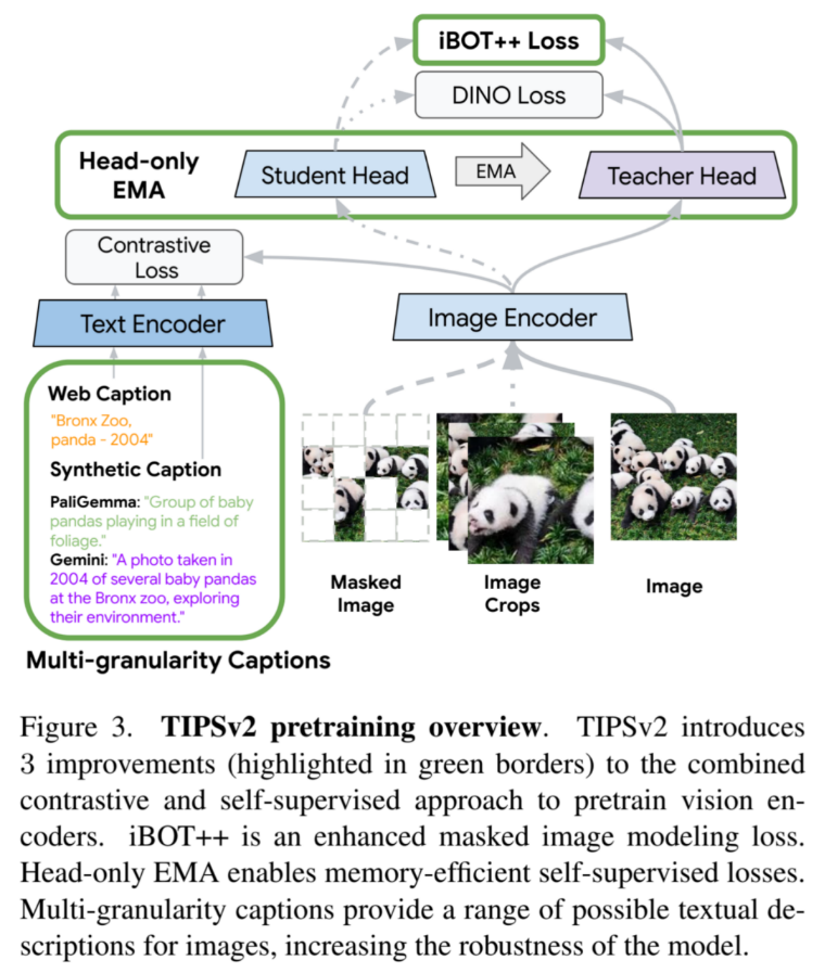 基于上述的反直觉洞察,DeepMind 团队直接对底层的多模态预训练配方进行了大刀阔斧的改革,提出了构成 TIPSv2 的三个核心技术组件: