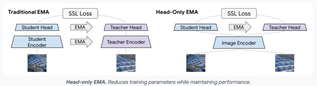 TIPSv2 团队在实验中发现,由于模型同时接收了强有力的 “文本监督信号”,底层视觉骨干网络在训练初期就已经具备了很好的稳定性。因此,他们提出了创新的 Head-only EMA 策略 —— 仅对顶层的投影头(Projection Layers)执行 EMA 更新,同时冻结视觉主干网络的 EMA。这一策略在完美保持模型卓越性能的同时,大幅度降低了训练时的显存需求,极大提升了模型训练和扩展的性价比。