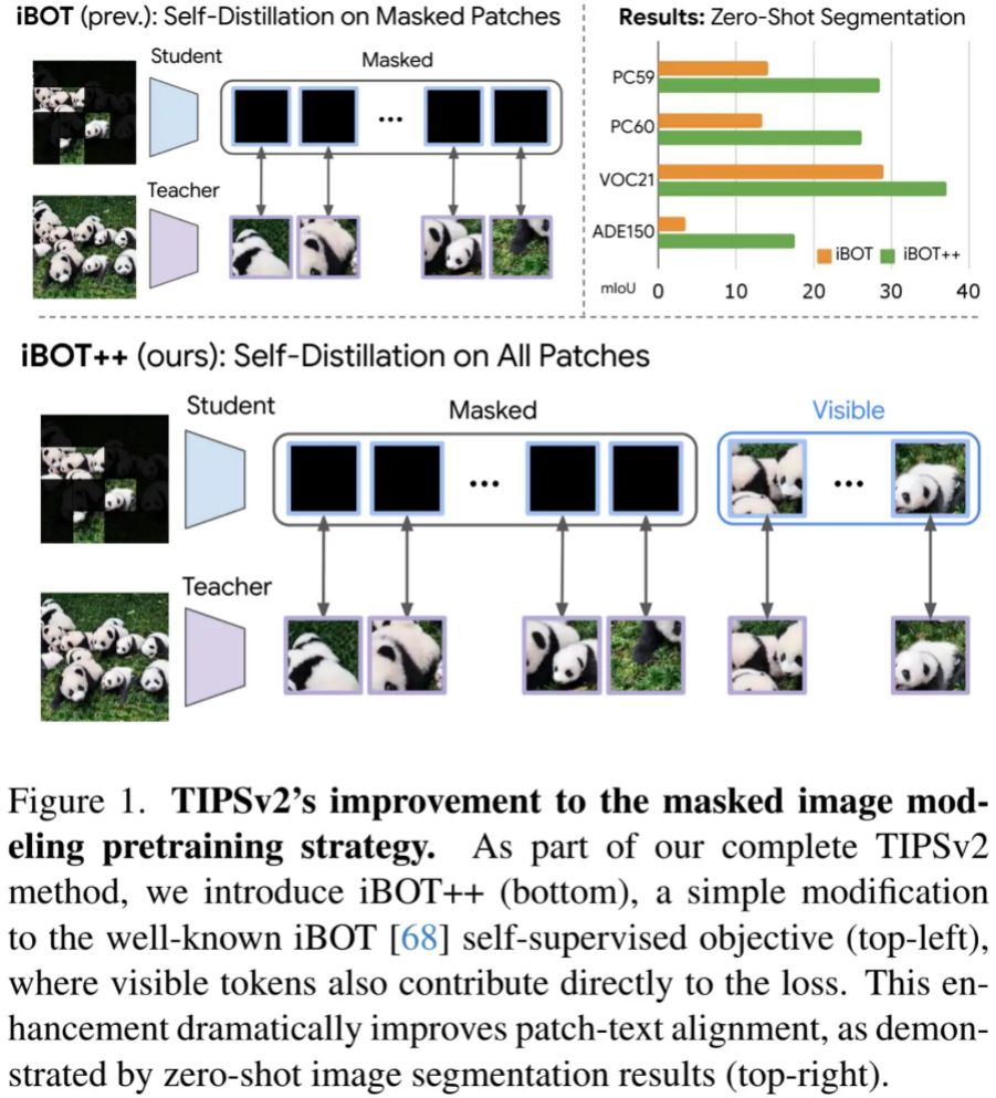 在经典的 iBOT(被 DINO 等强大视觉模型广泛使用)目标函数中,损失仅针对 Masked Tokens(被掩码的标记)进行计算。TIPSv2 打破了这一范式,引入了全新的 iBOT++ 目标机制。该机制将自监督的 Patch 级别损失强行扩展到了所有的 Tokens(包括未被遮挡的可见 Tokens)。