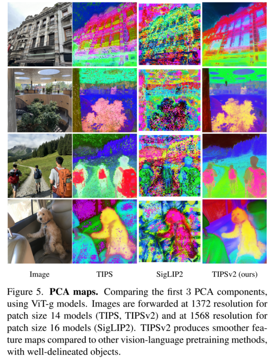 除了硬核的量化指标外,团队还通过主成分分析(PCA)对模型的特征图(Feature Maps)进行了直观的视觉分析。相比于上一代 TIPS 和业界流行的 SigLIP2,TIPSv2 的特征图展现出两个极其显著的碾压级优势: