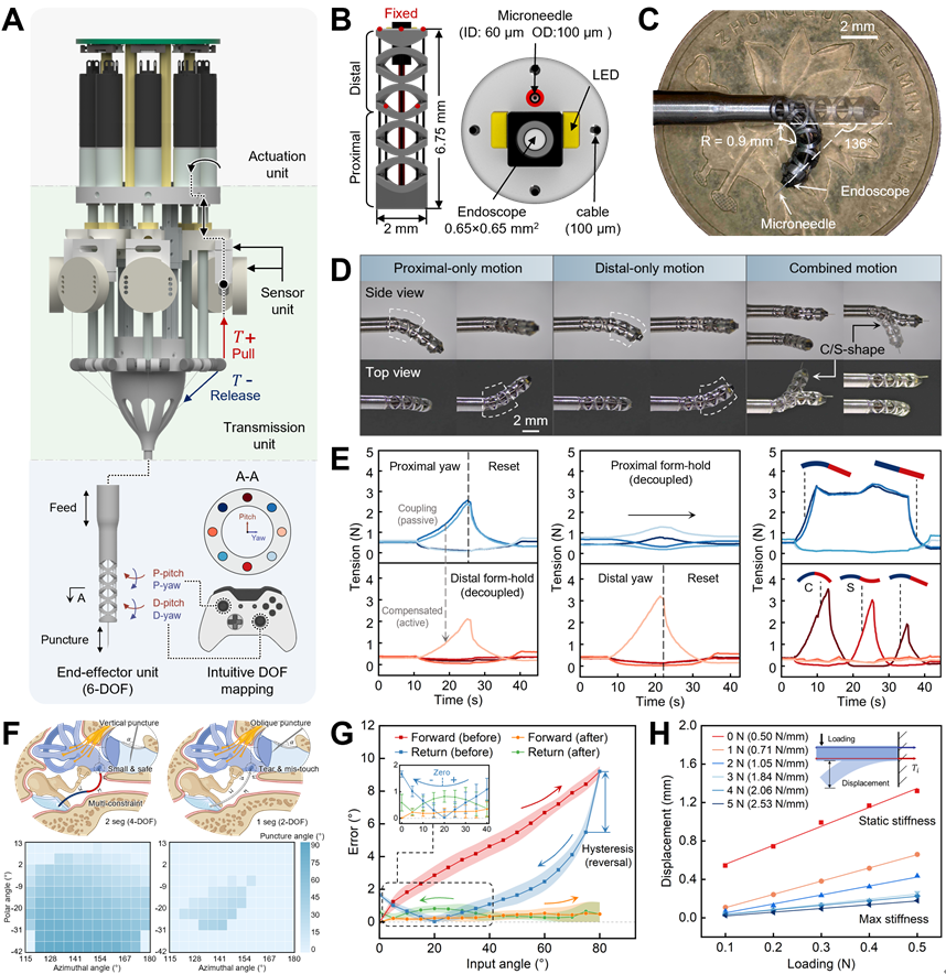 传统连续体机器人虽已应用于部分微创外科领域,但适配内耳诊疗时短板显著:要么自由度不足、弯曲性能差,无法完成复杂解剖结构的导航;要么难以集成内镜可视化、组织交互感知等关键功能,微型化、灵巧性、感知功能的三重约束,是内耳微创诊疗技术发展中长期面临的关键难点之一。