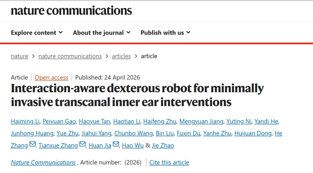 与传统内耳手术入路相比,这一源头创新成果依托耳道这一人体自然腔道完成手术入路,在实验模型中展现出减少组织损伤的潜力,相关结果显示,该创新成果在降低组织损伤方面具有研究潜力,未来仍需进一步验证其临床应用价值。该技术可进一步结合基因治疗手段,为相关儿童内耳疾病的早期干预研究提供新的技术参考,有望开辟从早诊断、早干预到术后无创治疗的新路径。相关研究成果以《Interaction-aware dexterous robot for minimally invasive transcanal inner ear interventions》为题发表于《自然·通讯》(Nature Communications)。