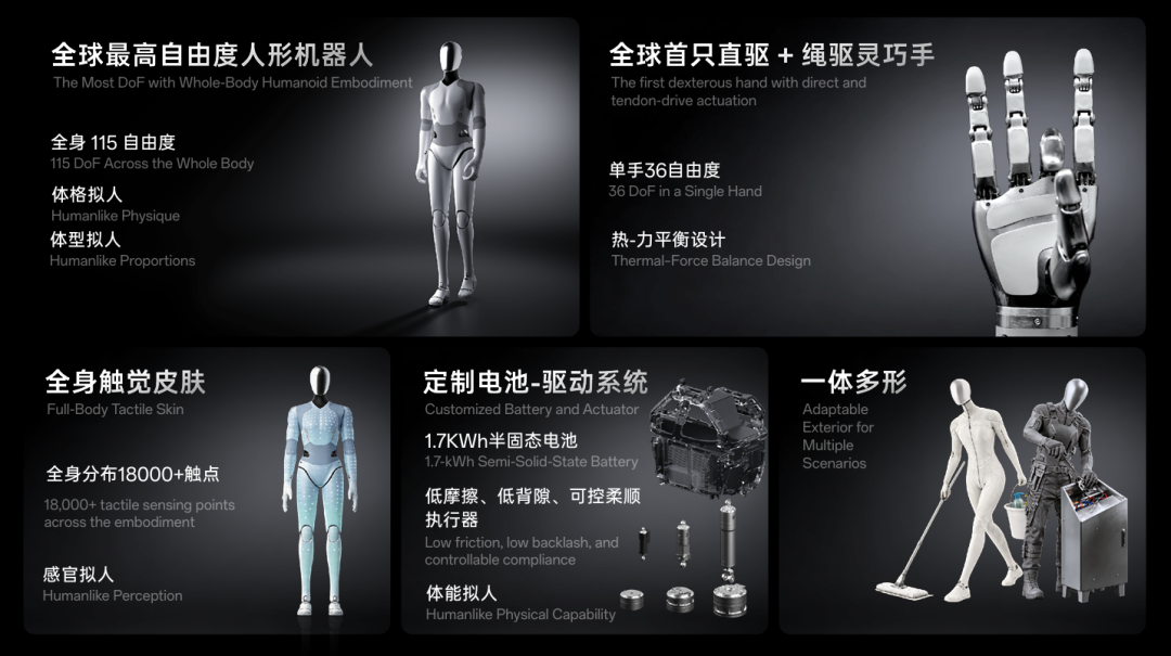 工程师为此研究了生物工程学和解剖学,「逆向了人类的肌肉应力关节的力学支撑系统」。这个设计哲学从体型比例一直贯穿到触觉皮肤,涵盖了体型、体格、体能与感官四个维度。