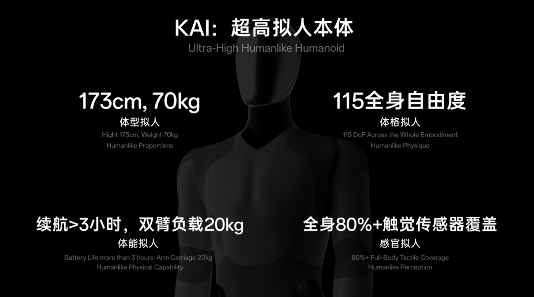 这些数字是审美选择,更是工程约束:只有尺度与人类高度吻合,KAI 的动作轨迹才能精准对齐人类数据,才能无缝兼容为人类尺度设计的空间和工具。