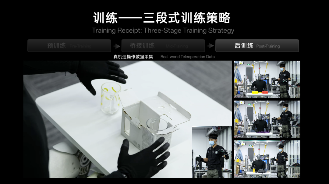 第三阶段是后训练。引入真机遥操作数据,把此前训练好的模型与 KAI 的实体硬件完成最终对齐。