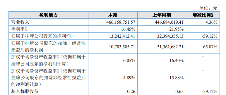 财务数据方面,2024年至2025年,该公司实现营业收入分别为44668.46万元、46615.88万元,同比增长4.36%;归属于挂牌公司股东的净利润出现明显下滑,分别为3239.44万元、1324.24万元,同比减少59.12%;归属于挂牌公司股东的扣除非经常性损益后的净利润同样有所回落,分别为3136.17万元、1070.36万元,同比减少65.87%。