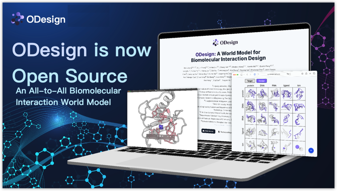 此前,由张昊天作为一作兼共同通讯作者在临港实验室联合上海浦江实验室、华盛顿大学、哈佛大学、MIT 等科研力量共同推进的 ODesign 开源科研项目,定位于全球首个面向全模态的分子设计基座模型。