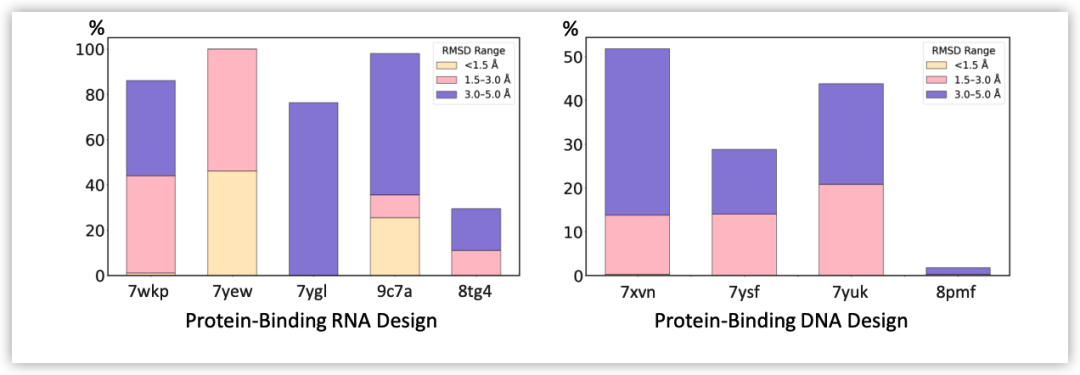 ODesign 在核酸设计任务中的跨模态迁移验证。 在 RNA / DNA 单体生成与蛋白结合 aptamer 设计中,ODesign 展现出向低数据核酸模态迁移互作规律的能力,其中 protein-binding RNA 任务体现了其零样本设计潜力。