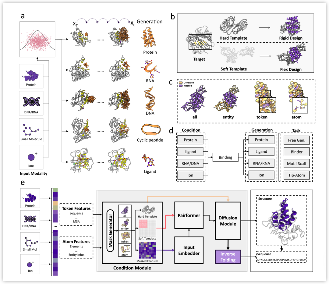 ODesign 全模态生成框架示意,ODesign 将蛋白、DNA、RNA、小分子与离子纳入同一生成框架,支持不同分子类型之间的 all-to-all 设计,并可在刚性或柔性靶标条件下生成目标结合分子。来源:《ODesign: A World Model for Biomolecular Interaction Design》
