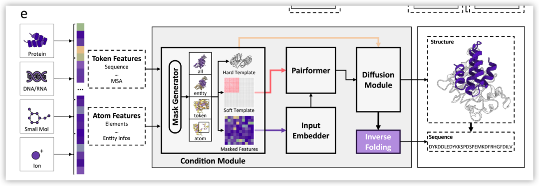 在这个基础上,ODesign 还构建了一套以结构预测为基础的生成式架构。团队先训练结构预测框架,再重构信息流和目标函数,让模型从 “预测这些分子会形成什么结构”,转向 “生成一个能按预期发生作用的新分子”。