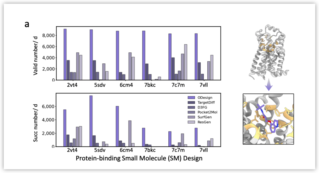 ODesign 在小分子设计任务中的表现。 在蛋白、DNA、RNA 结合小分子设计中,ODesign 展现出跨靶标类型生成小分子的能力,开始覆盖传统专家模型更难处理的跨模态设计组合。
