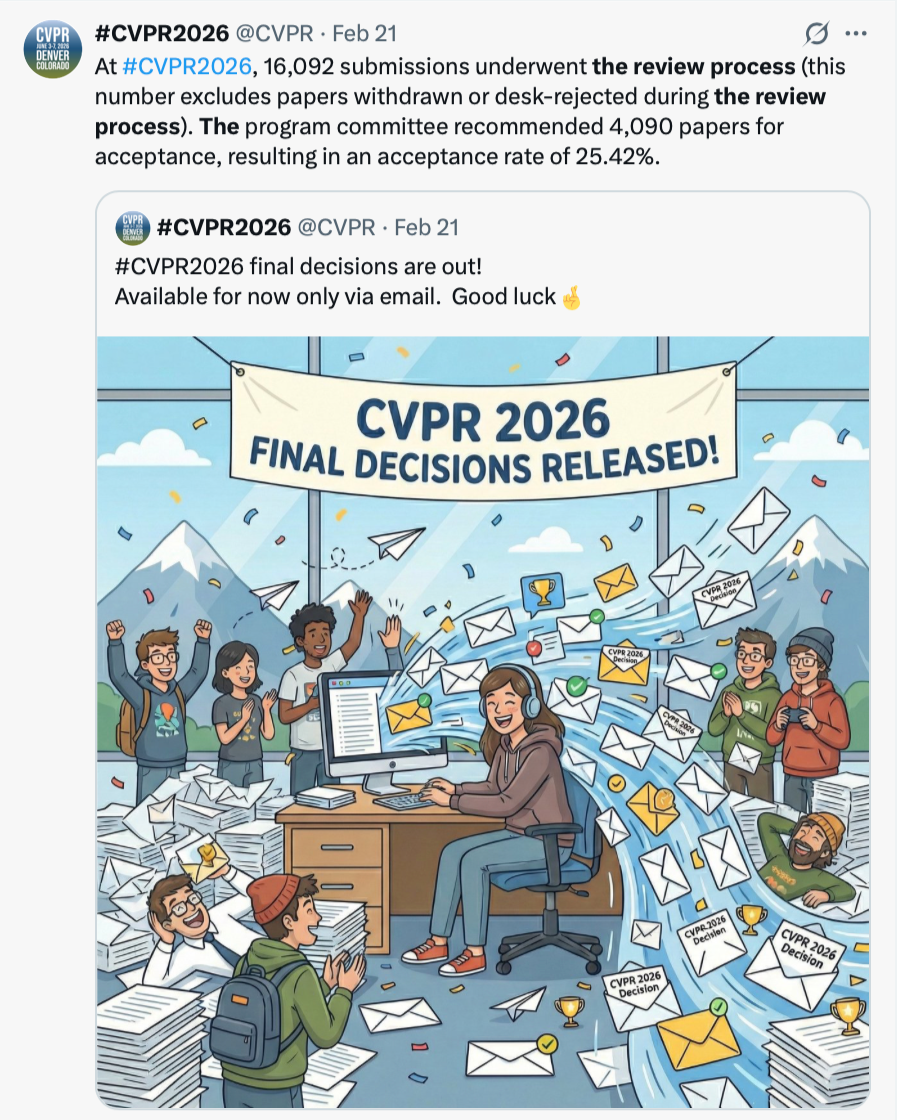 作为计算机视觉领域最重要的国际会议之一,CVPR 一直被视为视觉 AI 研究的风向标。今年 CVPR 2026 共收到 16092 篇投稿,最终 4090 篇被接收,录用率为 25.42%。