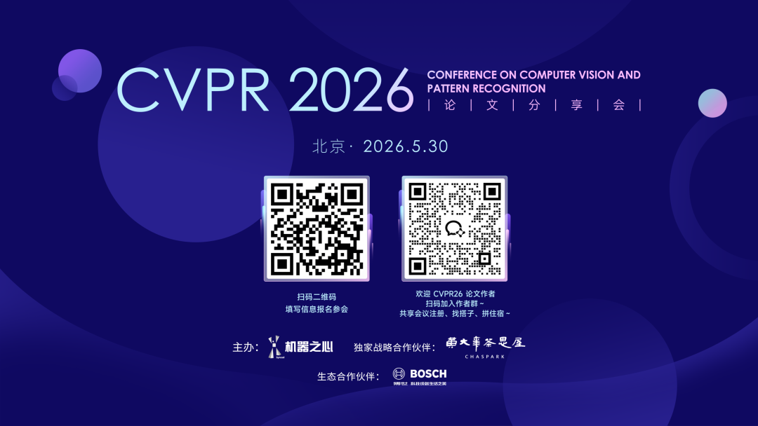 为了给广大 AI 从业者搭建一个自由轻松的学术交流平台,机器之心计划 5 月 30 日在北京举办「CVPR 2026 论文分享会」,广邀大家报名参与。如果有论文作者想要分享或者 Poster 自己的 CVPR 2026 论文,也欢迎扫描二维码报名!
